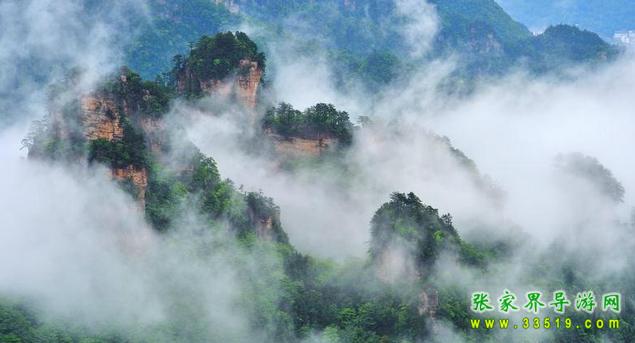 鷂子寨頂北沿有數(shù)處懸崖凌空凸出如臺(tái)。立臺(tái)鳥(niǎo)瞰,深谷陡峭如切,深達(dá)300多米,谷內(nèi)數(shù)十座石峰拔地而起,有如塔林。峰壁有的赭紅,有的灰白,均有節(jié)理橫斷,層次重疊。峰林直徑大者十多米,小者數(shù)米,或高或低,參差錯(cuò)落。有的上粗下細(xì),有的下大上尖,有的渾圓平齊,陽(yáng)光照射下均熠輝閃爍。峰頂或老松一叢,蒼勁挺拔,或灌木一片,蒼翠簇?fù)?。雨天云霧如濤,峰頂懸浮。此景即清乾隆《永定縣志》所記之“層巖涌塔”。