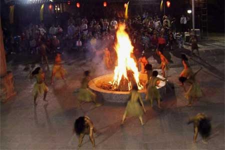 擺手舞的形式一般是這樣的:在擺手堂的中央高掛龍旗,四方點(diǎn)燈,由金童玉女給土家人用銅盆洗手,再?gòu)南慊鹕饺?lái)神火,然后在龍旗下點(diǎn)燃3堆篝火。隨著3聲炮響,先由梯碼法師(巫師)手舉八寶銅鈴作前導(dǎo),大家跟著翩翩起舞,徹夜不眠。