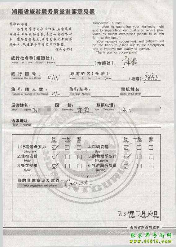 2009年7月15日周女士一行10人質(zhì)量接待反饋單:
